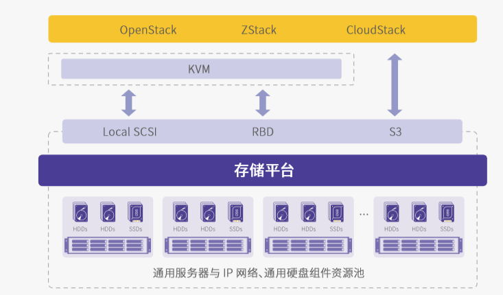 用户可以选择KVM实现计算虚拟化层,利用OpenStack、CloudStack或ZStack实现资源编排管理层。但在存储层面,不论是文件级的分布式存储GlusterFS,还是社区版的Ceph都不能为用户提供整体拥有成本可控的解决方案。